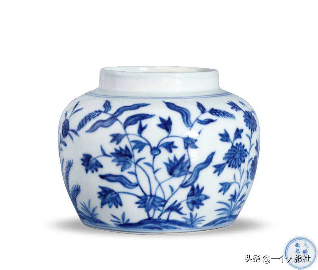 本品直口,短颈,丰肩,扁圆腹,圈足。器以青花绘菊花、石竹等盛开的花卉,间绘蝴蝶翩跹翻飞,摇曵飘香,为成化时期御窑瓷器。《博物要览》评价有:「成窑上品,五彩供养浅盏,草虫浅盏。青花纸薄酒盏,五彩齐箸小碟香盒……各制小罐,皆精美可人」。本品造型饱满,胎质细腻,釉质温润肥腴,画意生动,绘制纤柔精细,疏朗明快,为成化青花器中的精品,展现出陶工高超的技艺和艺术修养。