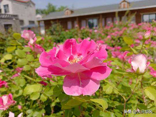 农忙闲暇时光,不时有村民漫步花间,赏花拍照,旁边原木色小木屋在月季花的映衬下,别有一番风情,村民或赏花聊天,或享受微风,非常惬意。