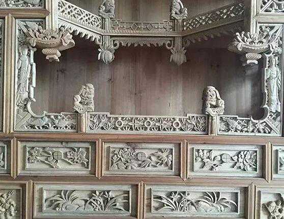 现今,在古徽州所辖县内木雕精品仍然随处可见。款县黄村一家民宅,在梁、仿、榇、斗拱、雀替上全部精雕细刻,装饰着灵兽、百鸟、蝙蝠和回文图案,布局严谨,造型优美。楼下围着天井的24届镂花隔后门,上半部是连续图纹漏窗,下半部是浮雕花鸟隔板,连接上下两半部的中间横板,则雕刻着戏曲故事,内容皆出自《三国演义》戏文。