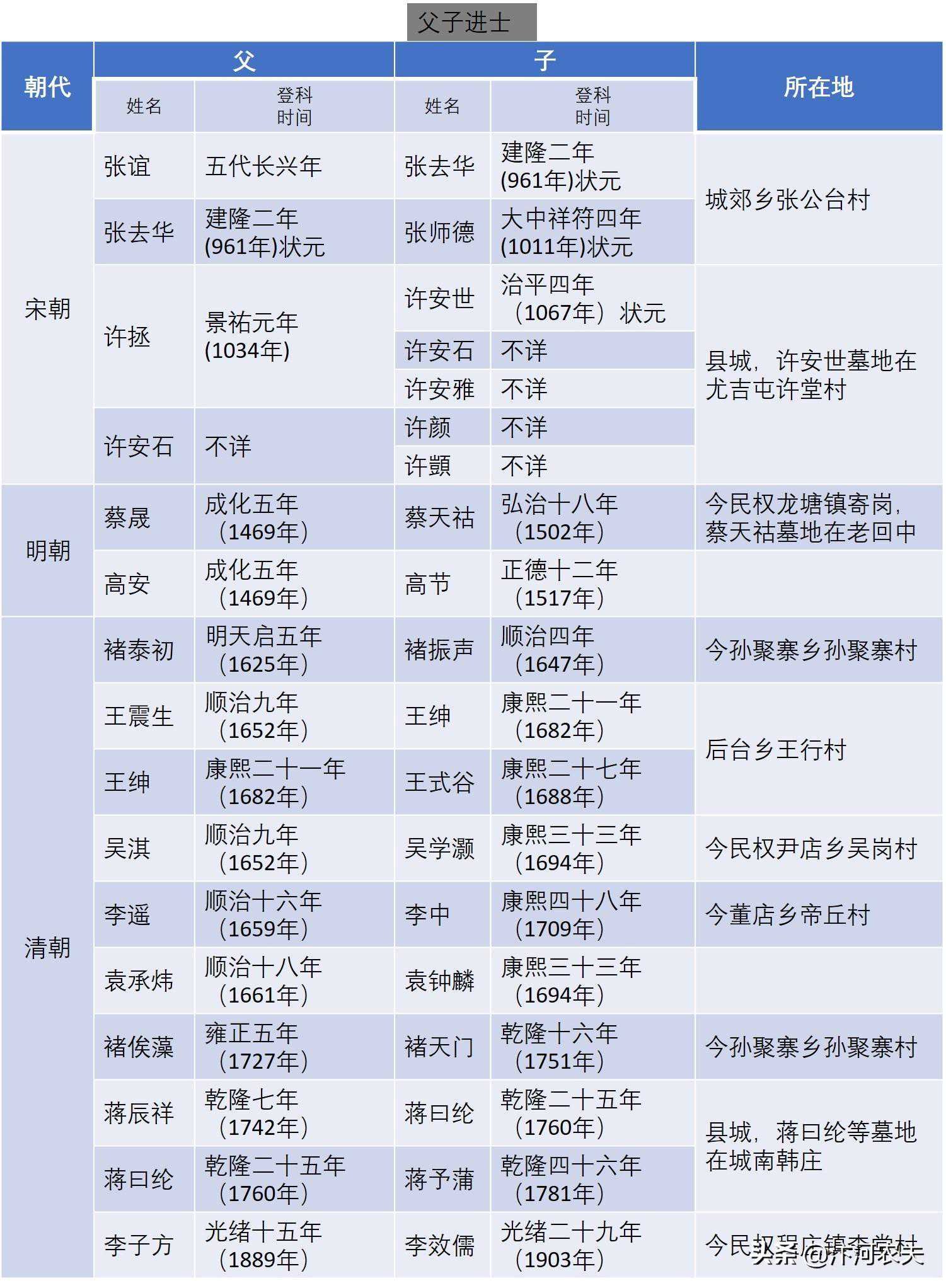 北宋,睢县张氏家族出现父子状元。睢州张氏崛起于五代时期的张谊,是长兴时期的进士。张去华为大宋朝第二位状元,他的儿子张师古为国子博士,张师锡任殿中丞,张师颜为国子博士,其中第十子张师德在大中祥符四年(1011年)又考中状元,被称为父子状元,一时传为美谈。后移居洛阳,被称为静居张氏,为洛社中人,为洛学的孕育贡献了力量。