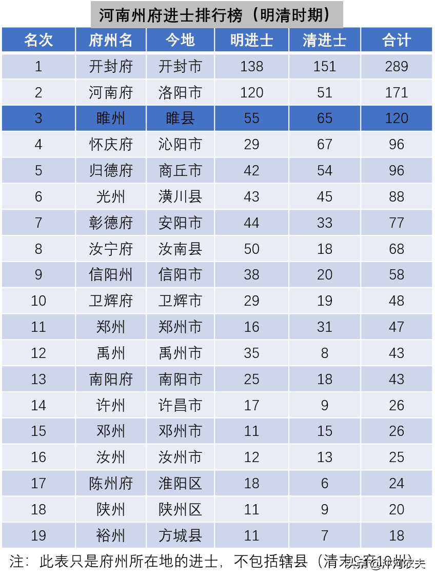 睢州历史上出现,宋父子状元、祖孙状元,元兄弟三进士,清祖孙三代翰林,千年不衰,代不乏人。仅明清时期,睢州出现父子进士12对,兄弟进士5对,出现一门九进士的兵马袁氏,一门七进士的睢阳王氏,一门六进士的褚氏等,有“汤王袁蒋”四大家族。睢州文化世家持续千年,如此集中,还有后裔居住于此,在全国恐怕是唯一的。