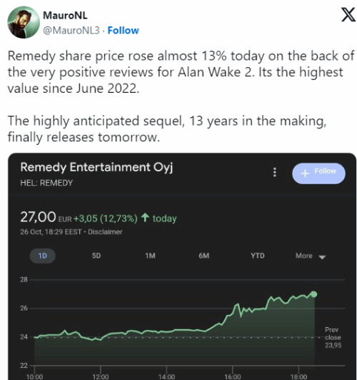 与此同时,Remedy工作室的股价也一路向好,游戏分析师MauroNL发现,该公司股价近期增长了13%,创下2022年6月以来的历史新高。可谓是口碑业绩双丰收。