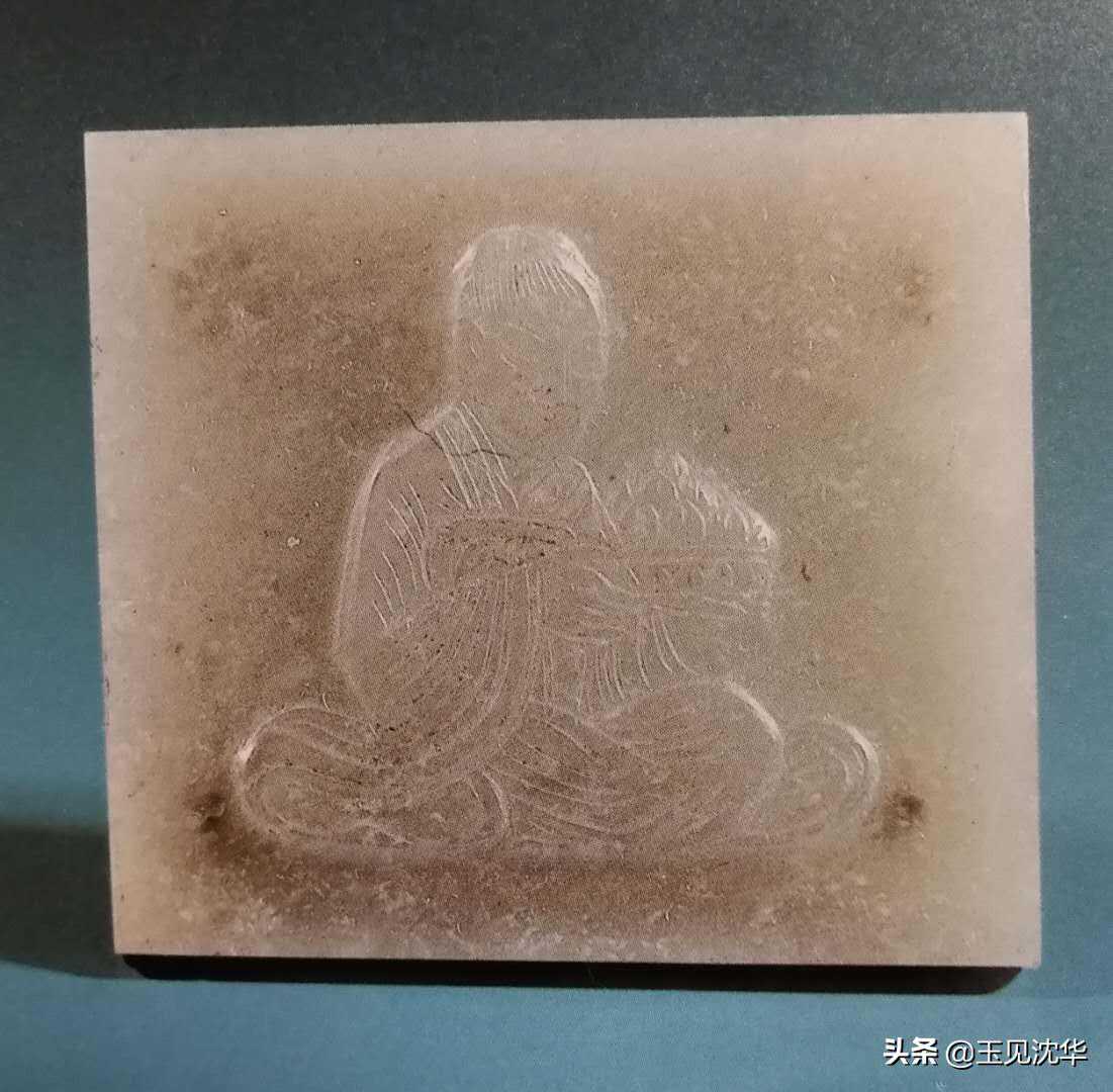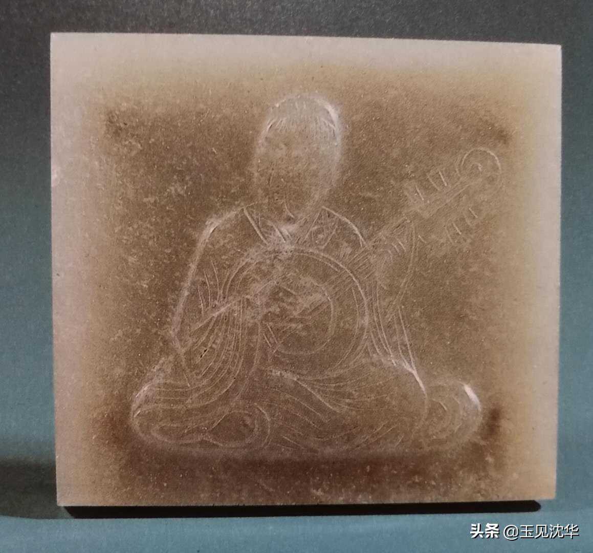 在带板上用浅浮雕的形式雕琢细阴刻人像,人像从整体上看感觉是上部较窄,而下部较宽,衣褶较多地使用了近似于平行的阴刻长弧线。