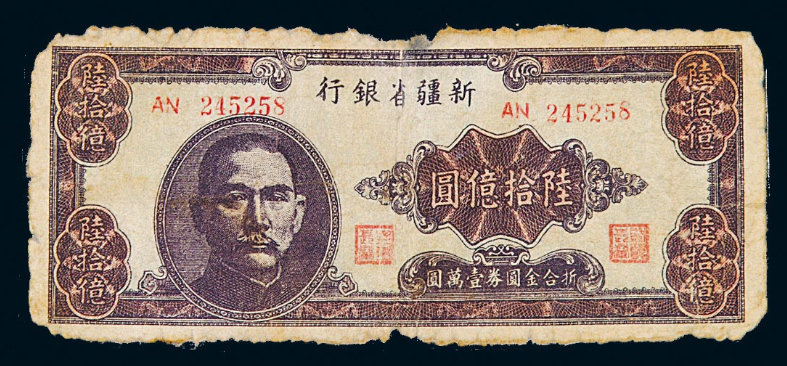 2008年秋拍,1949年新疆省银行金圆券陆拾亿圆一枚,五成新,拍卖成交价4480元。