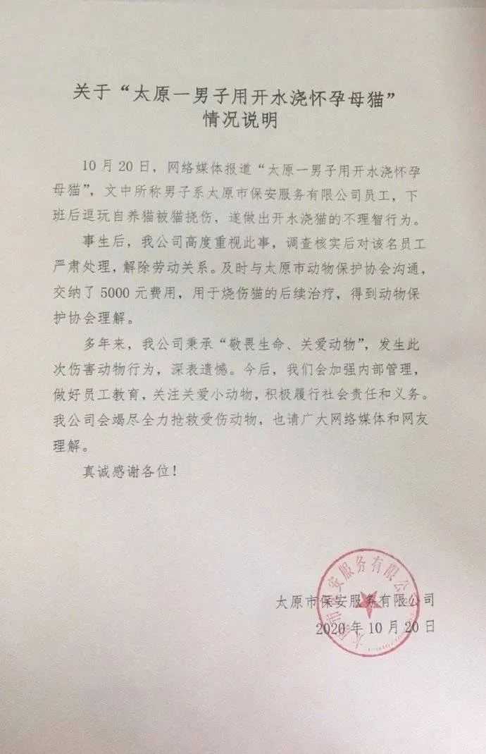 事发后,涉事男子所在的太原市保安服务有限公司发布情况声明称,针对有媒体报道“男子系太原市保安服务有限公司员工,下班后逗玩自养猫被猫挠伤,遂做出开水浇猫的不理智行为”,调查核实后对该名员工严肃处理,解除劳动关系,及时与太原市动物保护协会沟通,交纳了5000元费用,用于烧伤猫的后续治疗。