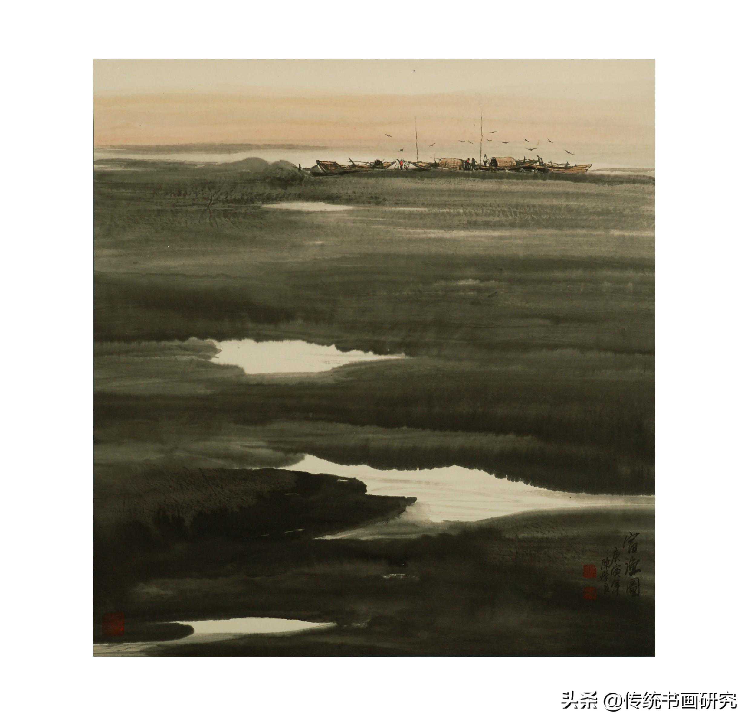 陈先生是将点彩用到极致的人,他的过人之处是在湿的气氛里营造一种毫无渣滓的光明。这种光明由墨而发,由笔而生,由彩而活。他擅长用墨反复营造一种湿漉漉、雾蒙蒙的意境,然后用笔勾勒明确山石轮廓,最后用彩补充完善。再加上点景人物、舟桥、飞鸟、家畜等,让作品诗意盎然、极富生活。所以,我以为,陈先生的高明之处在于以南方的温婉、沉郁、北方的雄浑诗意写家乡冰雪山水里的旺盛生命力。尤是其四季山水中的春、夏、秋景,既有传统哲学中互为依存的学术思辨,又有怅然抒怀的文学情境。概括起来,他以古法开生面,形成了我之为我的画法。并在前辈的基础上赋予东北山水新的精神风貌。