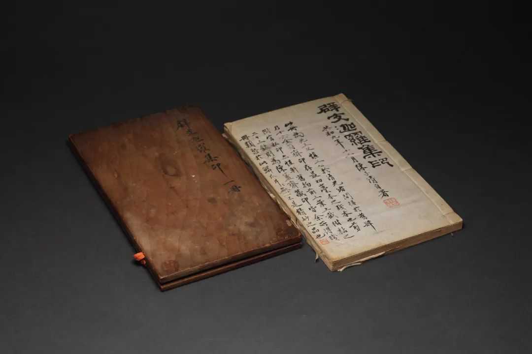 此册乃集晚清民国诸名家所作书画题拓而成,主体为吴大澂手书金文集联六对,罗振玉亲书释文一页,并有吴氏绘于十六金符斋印谱页上山水一帧。其余为吴大澂所集金文拓片及郑文焯所题拓片印蜕数种。册前有吴隐手札一封,其中提到与吴昌硕赏雪之会。虽小小一册,实收纳多位晚清名家手迹,内容丰富,殊可把玩。
