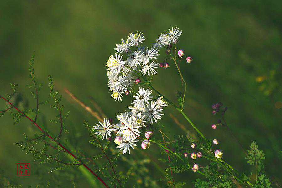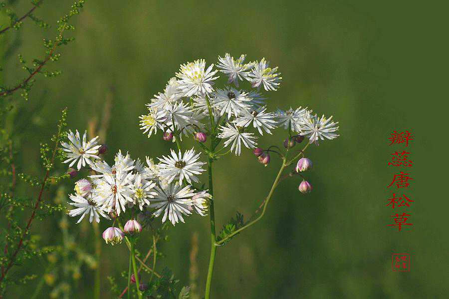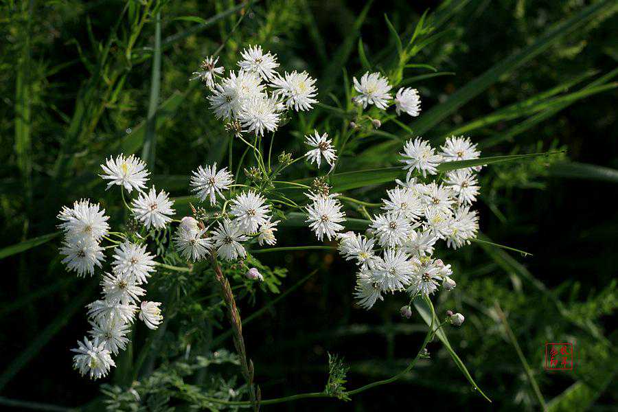 瓣蕊唐松草,别名马尾黄连、多花蔷薇,毛茛科唐松草属。瓣蕊唐松草为多年生草本植物,茎高20-50厘米,分枝。叶为3-4回三出复叶,互生;小叶倒卵形、近圆形或菱形。伞房状聚伞花序;花梗长0.5-2.8厘米;花直径1-2厘米;萼片4,白色,卵形,长3-5毫米,早落;无花瓣;雄蕊多数,长5-12毫米;花丝中上部棍棒状倒披针形,白色,比花药宽,或成花瓣状。花期6-7月。瘦果卵球形,长4-6毫米,宿存花柱直。