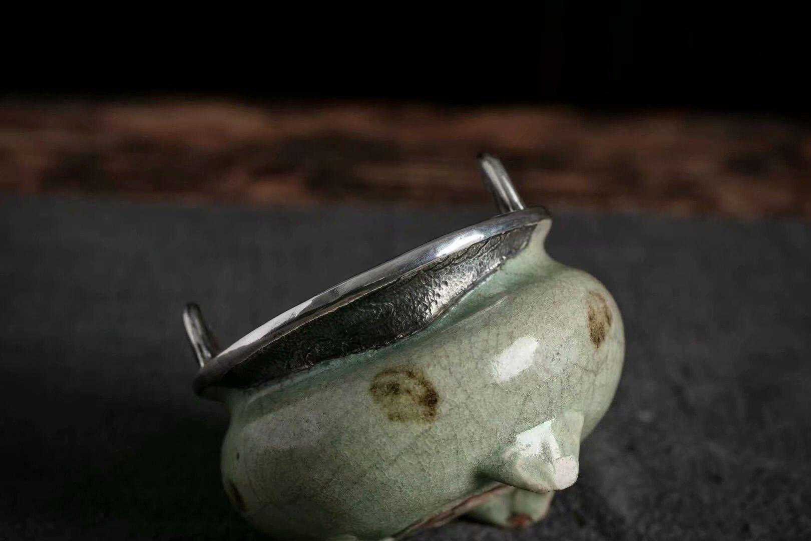 【乘物游心】:心物相融·繁花相生,点彩是元代龙泉窑高档品种之一,香炉整体完整较为难得,炉身一侧因窑内烧制时粘连其他器物导致轻微变形,后采用纯银錾刻流云纹进行二次创作,通过这样的精心创作后更好体现出该炉的非凡气质和与众不同的艺术形态!