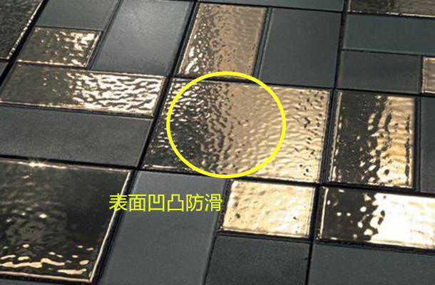 家里住着年轻人还好,但是对于老人和小孩来说,沾了水的瓷砖表面很容易出现滑倒摔倒的现象,增加安全隐患。而这种金属瓷砖拼接铺地设计,表面的凹凸设计,增加摩擦力,不容易滑倒。