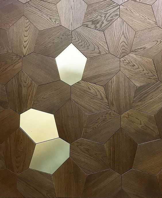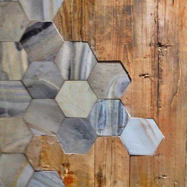 也可以把木板和大理石混合一起铺地,可以做竖状条纹样式铺贴,也可以把大理石做成六角形状混合木板一起铺地,效果都挺好。相对于金属砖来说,大理石价格略微便宜一些,可供选择的款式更多。