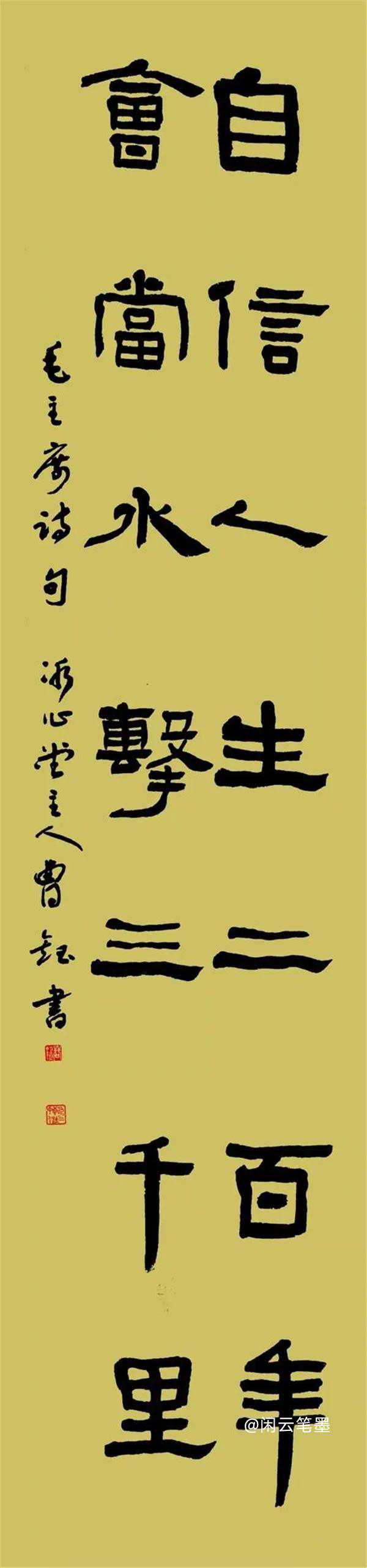 曹钰的这幅字写的是毛主席的诗句,自信人生二百年,会当击水三千里。这幅隶书作品字距大、行距近,字形长的很长,扁的很扁,典雅古朴。
