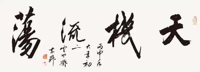 姚东升的这幅字写的是天机流荡。这幅字线条舒展,字形大小参错,“流”字过于小巧,小字补白,整体上还看得过去。