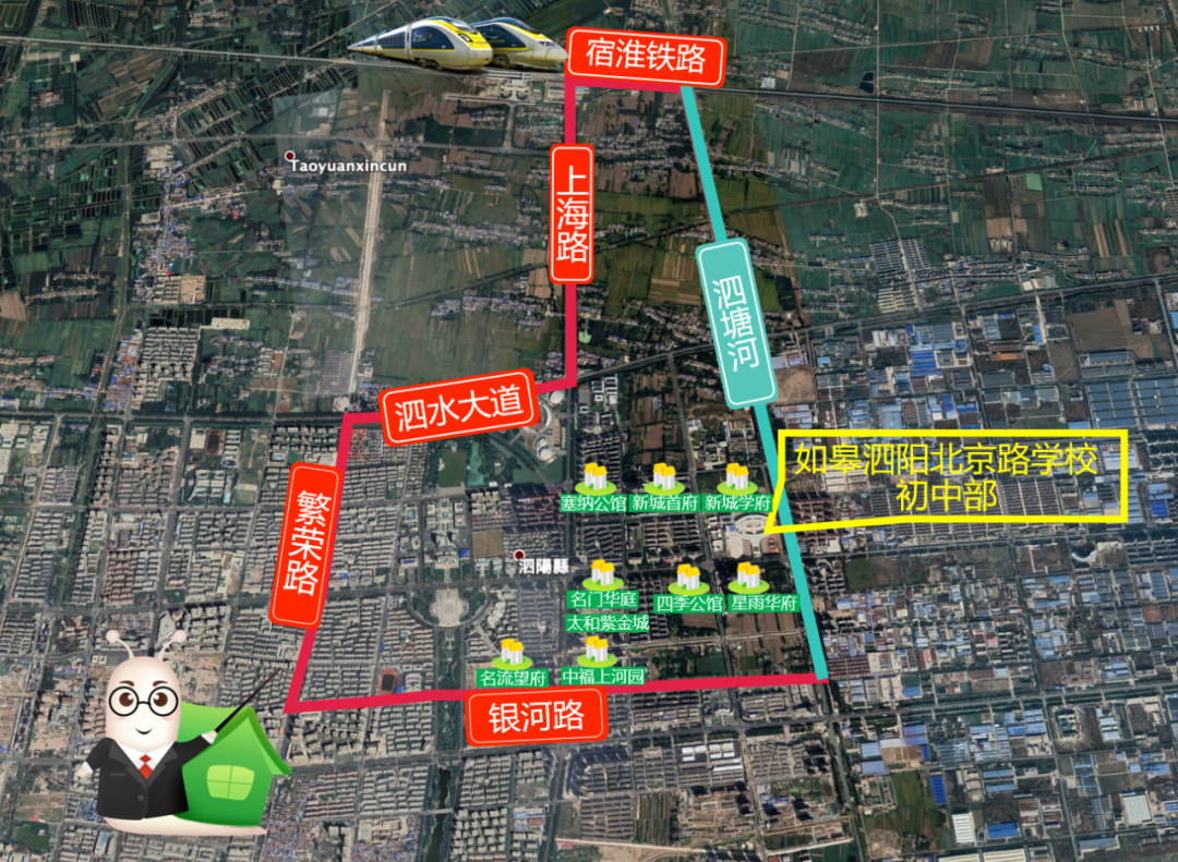区域内新房小区:康桥水岸、富园名都、香缇花园、望湖名都、吾悦华府、泗都府、芙蓉苑、新城时光印象、华阳康城、恒茂凯旋城、马德里花园、运河首府、左岸逸品、米兰春天。