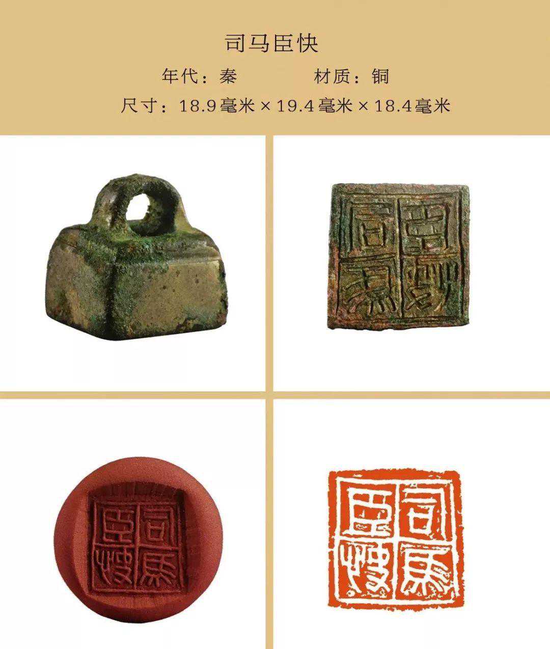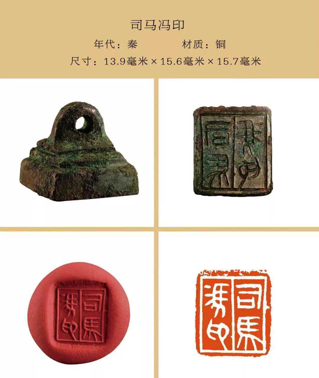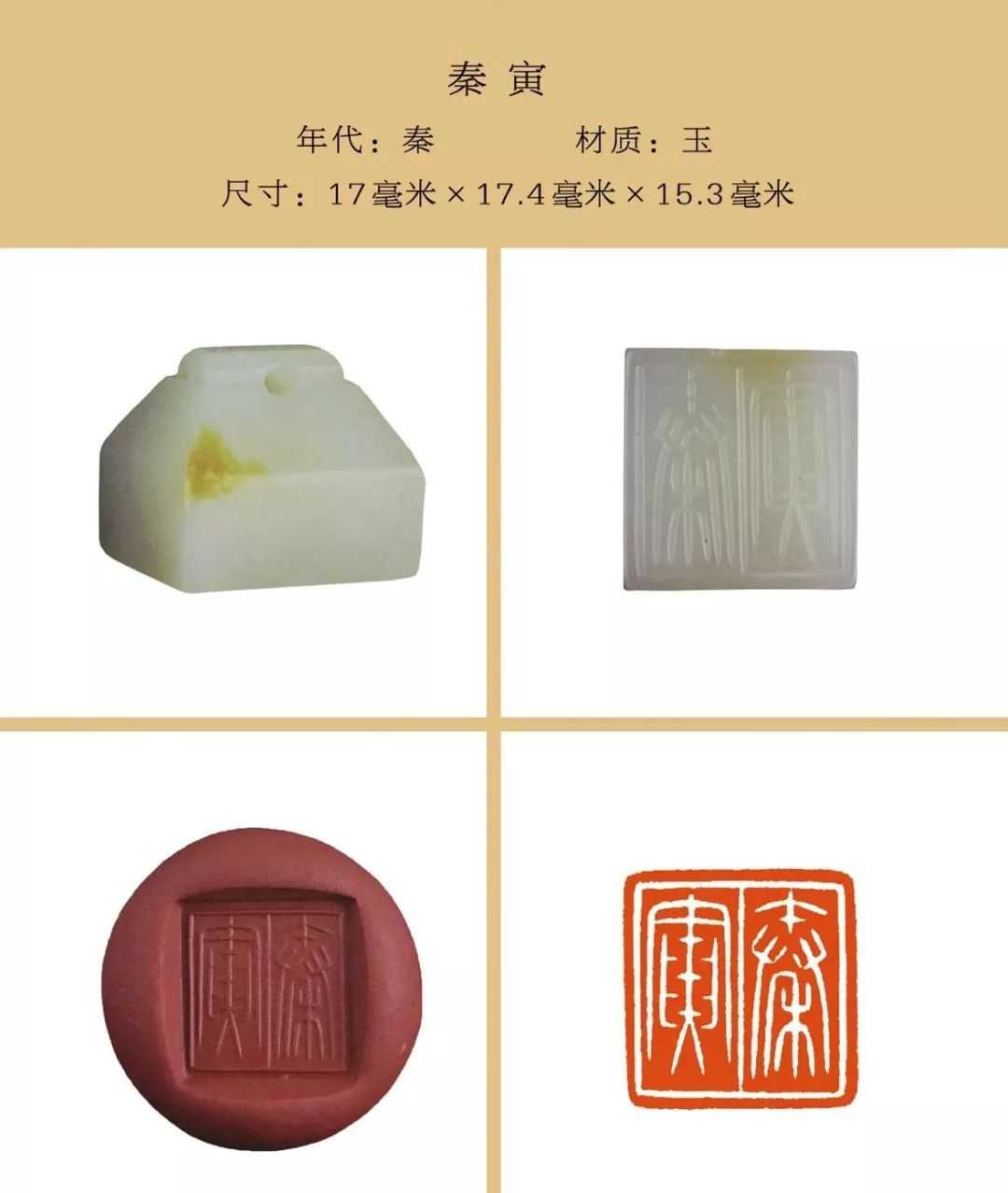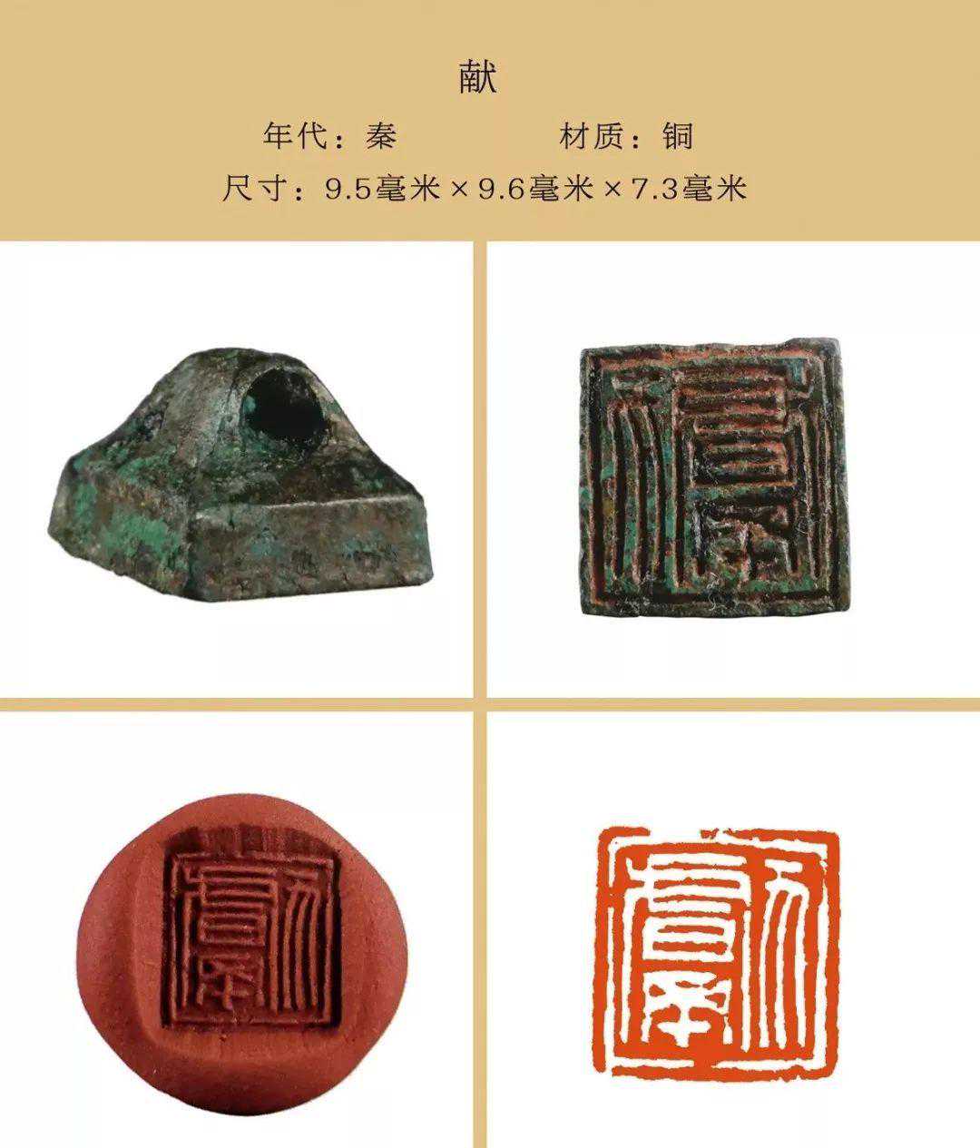 秦私印选自吴砚君先生主编的《盛世玺印录》。材质上分为玉印和铜印两种,字数最少一字,最多四字,尺寸除一件超过两厘米外,其他均在两厘米以内,且都有边框和界格,或加直隔线,或为田字格,长方形印(又称半通印)多用日字格。公元前221年秦始皇统一六国,统一文字,故秦私印书体风格趋于规范严谨,方整秀润,易于识认。纵观其特点还略带有战国文字遗风。印文章法布白,挪让有度,尤见古人匠心。