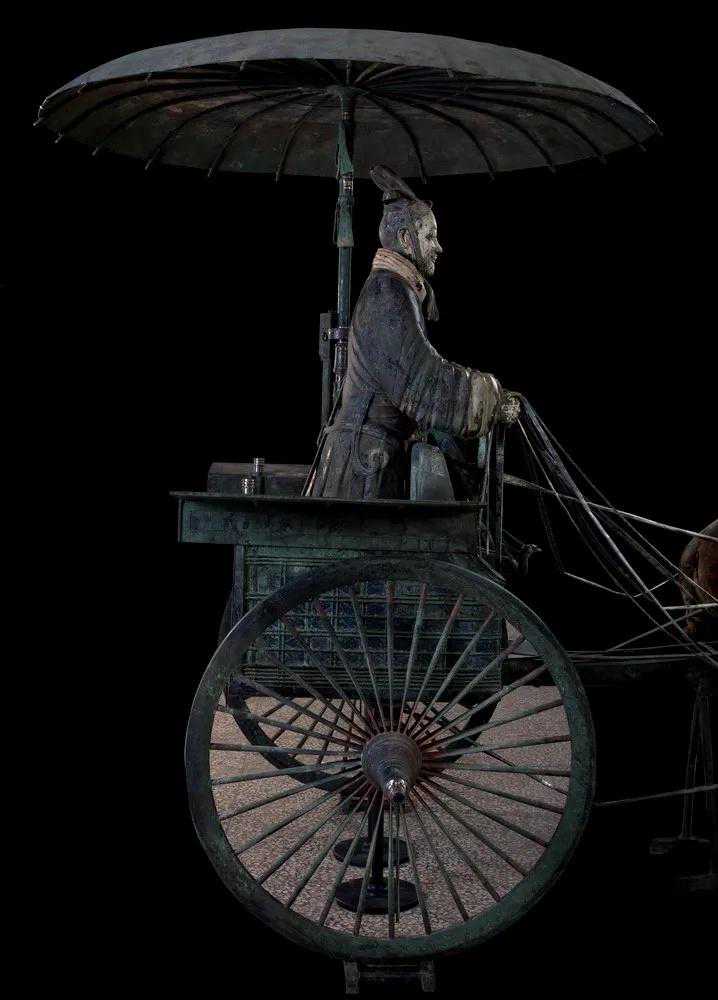 一号铜车的舆内立一伞形的车盖,固定车盖的是一樘建有粗壮桯柱的十字形盖座。伞盖面积大于车舆,将车舆全部罩于伞下。