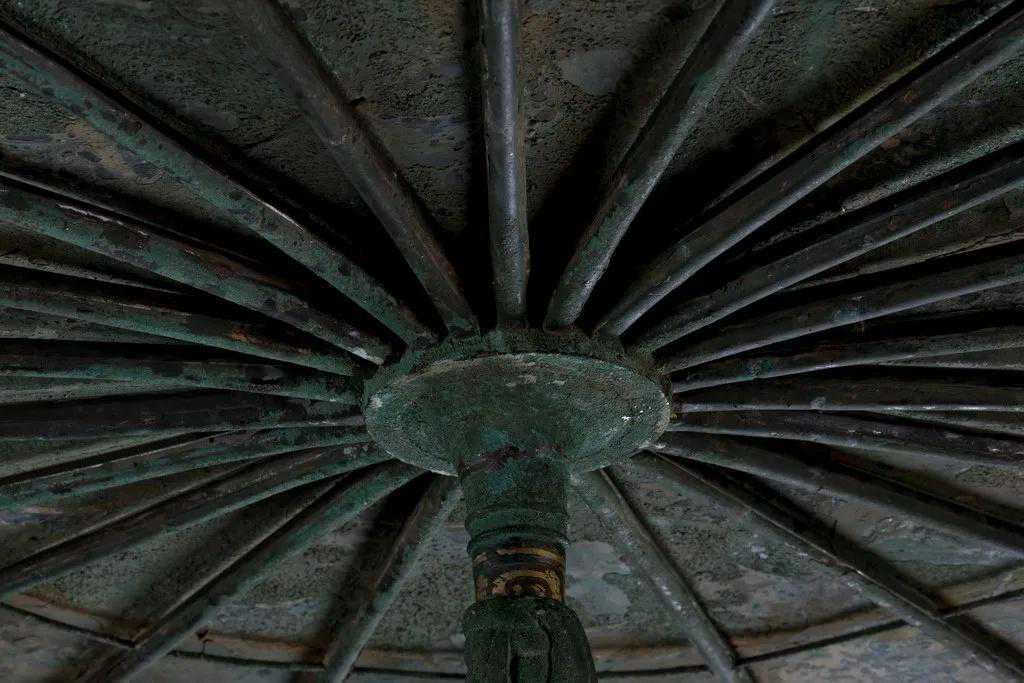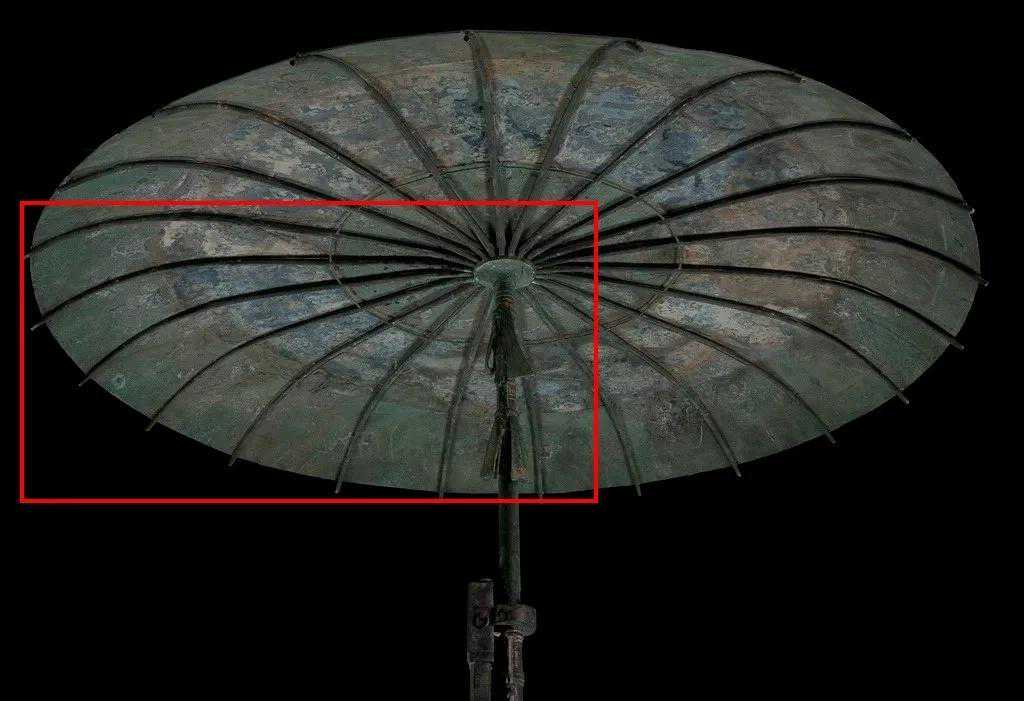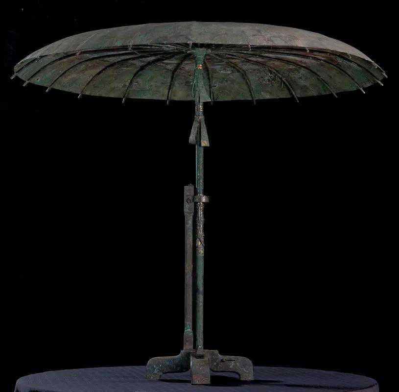 撑托盖衣的支架由盖斗和盖弓构成。盖斗呈蘑菇形,与盖杠铸连一体。盖斗的短颈古名达常,又名部。