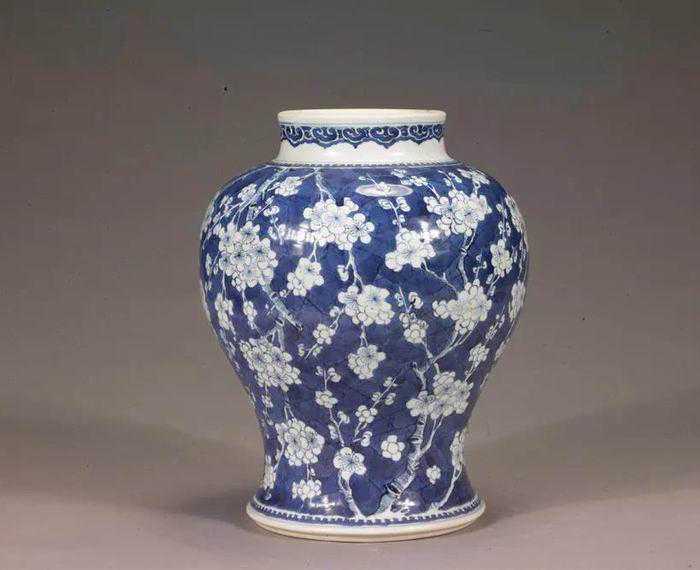 到了清代,冰梅纹是清康熙年间创烧和流行的陶瓷装饰纹样,多用于碗、瓶、罐等器物上。其以青花为地绘冰裂片纹,与白色梅花相映。