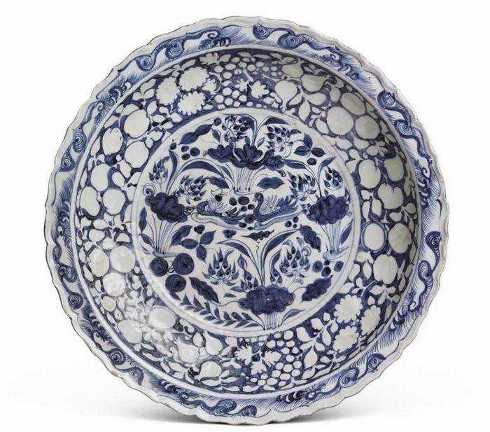 展览中有一件口径42.5厘米的“景德镇窑青花莲池鸳鸯纹图菱花口盘”与众不同,一般口径超过35厘米的大盘在元以前几乎不见,原因之一是其烧成难度过高。其二是器物功能不符合汉地人民的生活传统。相似尺寸大盘见于伊朗阿德比尔神庙和土耳其托普卡比宫,其产生可能与元代中东地区来华订烧的行为有关。