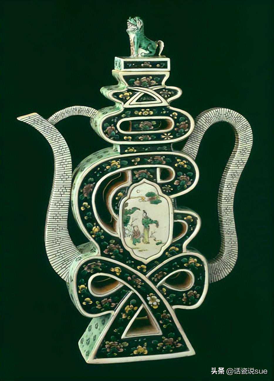 清康熙镂空五彩松竹梅纹六瓣壶
