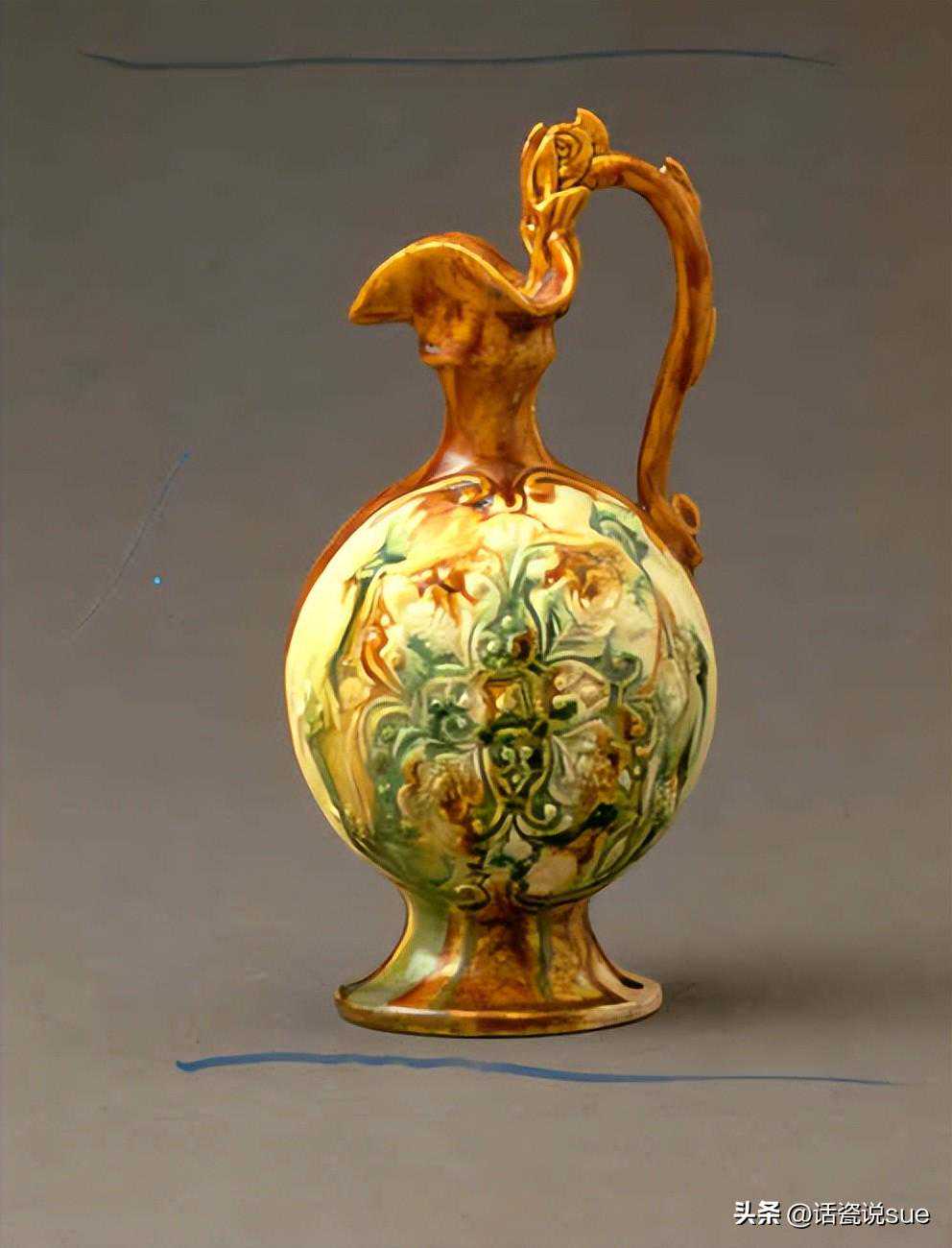 唐三彩凤首龙柄贴花注子8世纪