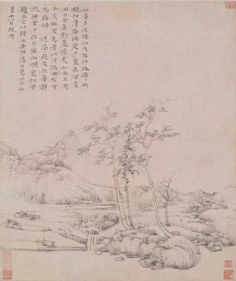 此画描绘秋山嘉树,沙碛孤亭。山石用折带皴,横笔点苔。画树取疏松之态,笔筒意赅。风格天真幽淡,意境荒寒。自题“七月六日……写秋亭嘉树图并诗以赠。”