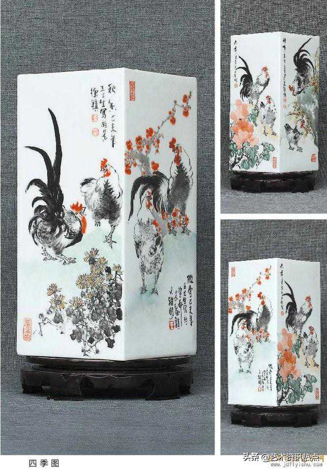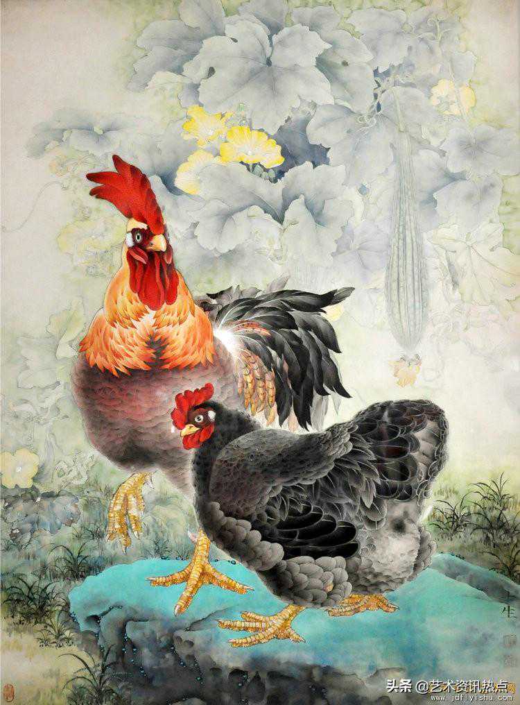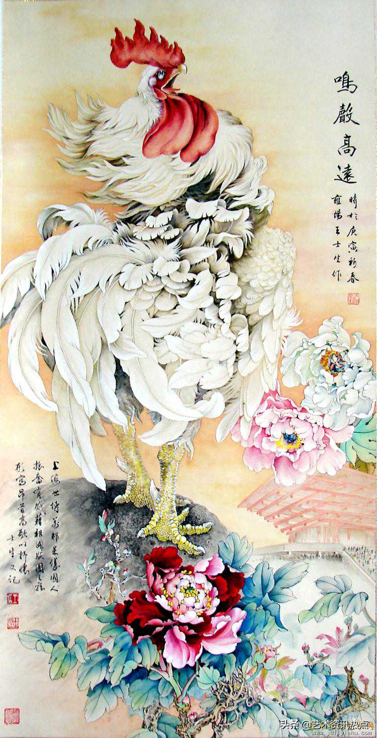 鸡在中华传统文化中被赋予了许多高贵的品格。汉代韩婴《韩诗外传》中提出“鸡有五德”,即文、武、勇、仁、信。王士生此幅《教子图》,画面整体呈对角线式构图,绘两只大鸡带领五只小鸡,雄鸡鸡首向左下方伸展,嘴中正啄着一只蚂蚱喂食小鸡。鲜红的鸡冠与周身的白羽形成鲜明对比,粗壮有力的鸡爪,造型准确生动,彰显了画家精湛的绘画功底,白色的鸡毛在明暗处理上颇具匠心,分成首、颈、胸、翅、腹、尾若干组,有的细羽绒毛分毫毕现,有的长羽飘飘姿态丰盈。小鸡的表现同样可圈可点,小鸡蜷缩在父母面前,有的低头啄食,有的张嘴争食,周身的绒毛蓬松细嫩,仿佛可以将其从画面中捧出托在手心里。但今日的小鸡仔,他日必将成长为引吭高歌的大公鸡,正如唐伯虎诗中所云:“头上红冠不用裁,满身雪白走将来。平生不敢轻言语,一叫千门万户开。”
