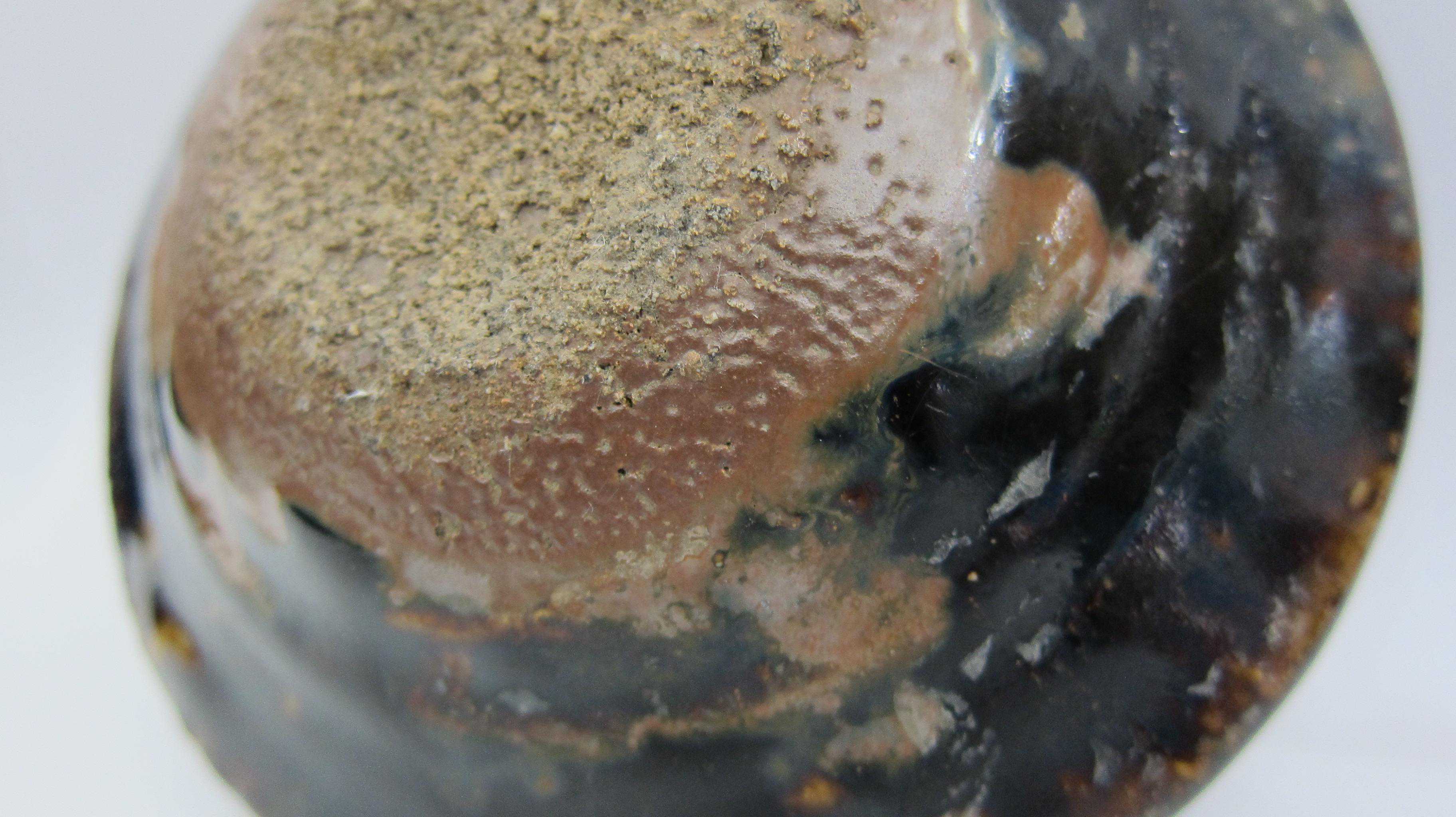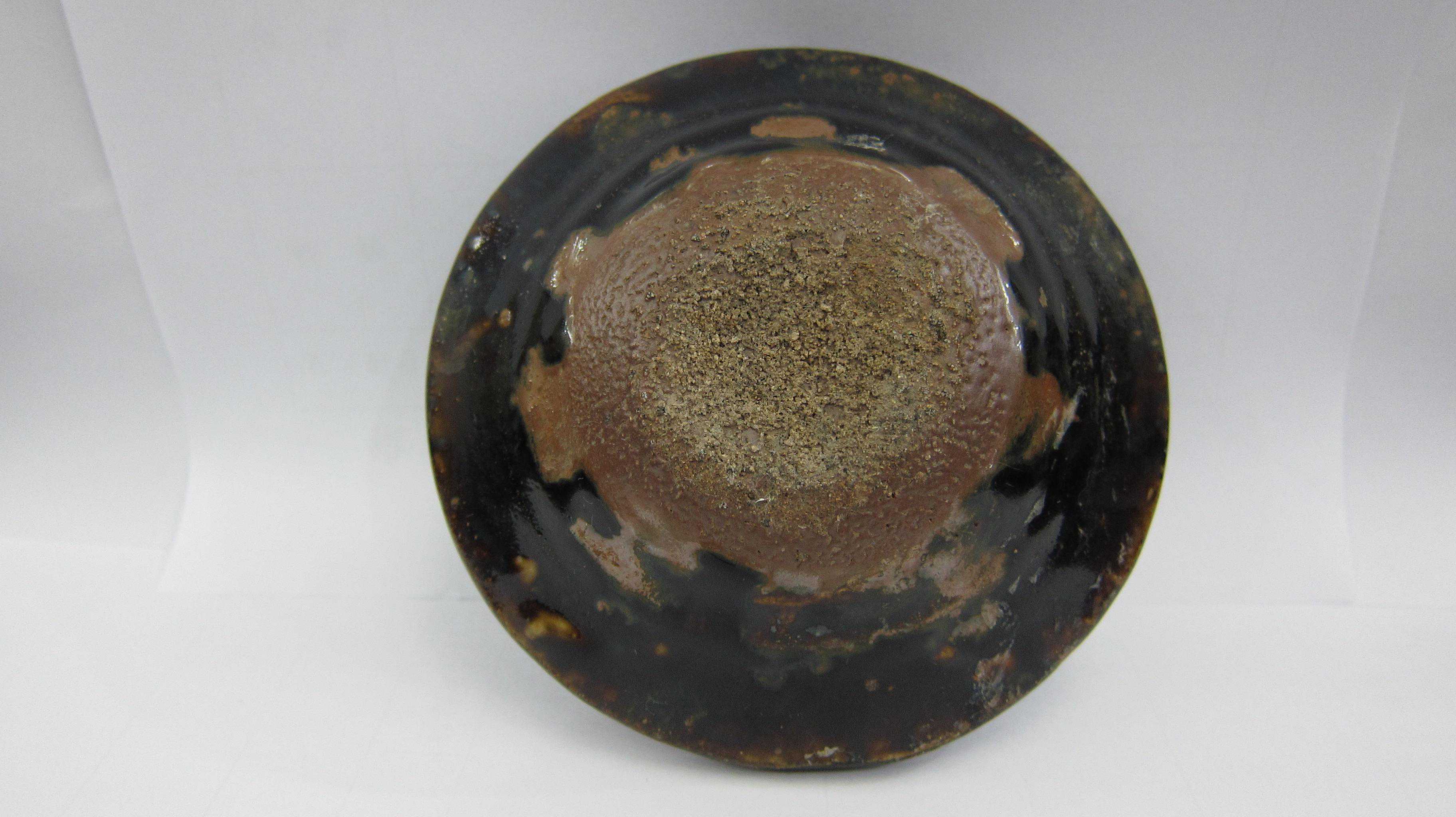 西坝窑是四川发现较迟的宋元时期古窑,位于乐山市五通桥区西坝镇。在上个世纪八十年代公路建设中发现的,由于公路建设战线长,开挖面大,比较全面地揭开了西坝古窑址群的概貌,从目前面世的窑址和器物看,西坝窑在宋元时期是西南地区无论是规模还是工艺都是一流的磁窑,只可惜没有文献记载。不过近年来民间对西坝窑的研究还是比较充分的,已有专著出版。这里介绍一件比较少见的宋代西坝窑黑釉灯盏,该盏,盏凹较浅,平底,上酱色护胎釉,烧结温度较高,黑釉面有微弱窑变,底部粘砂多,盏口直径10.7厘米,底径4.0厘米,高3.1厘米,盏壁厚0.6厘米。釉厚,护胎釉也比较厚,显然是一件比较精致的油灯盏。这样的灯盏川人俗称“灯盏窝”,著名川菜“回锅肉”就要将一片一片的肉片炒到“灯盏窝”的形状。