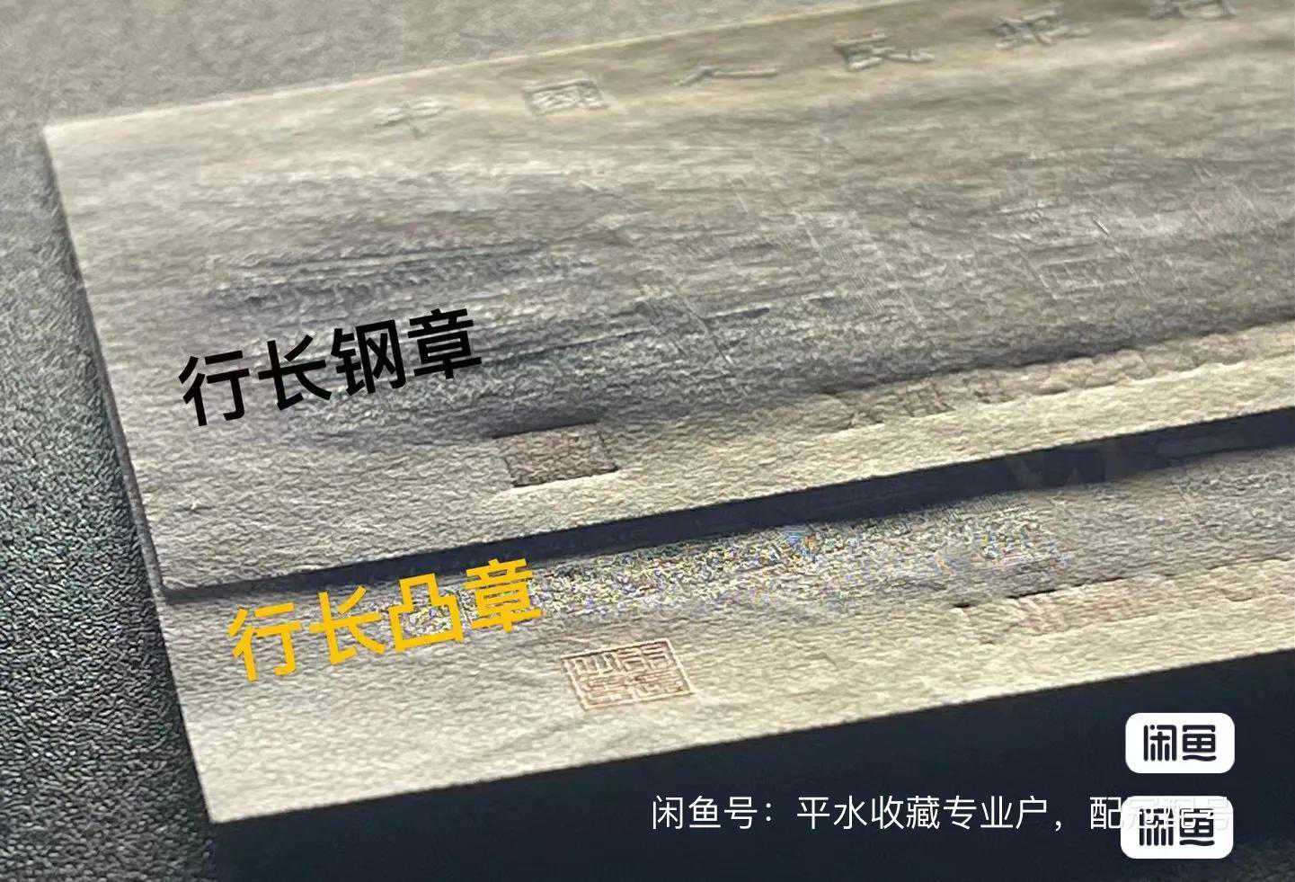 (1)钢章:从纸币正面看,行长章向下凹陷。行长章线条的外缘较厚较深,中间较浅;