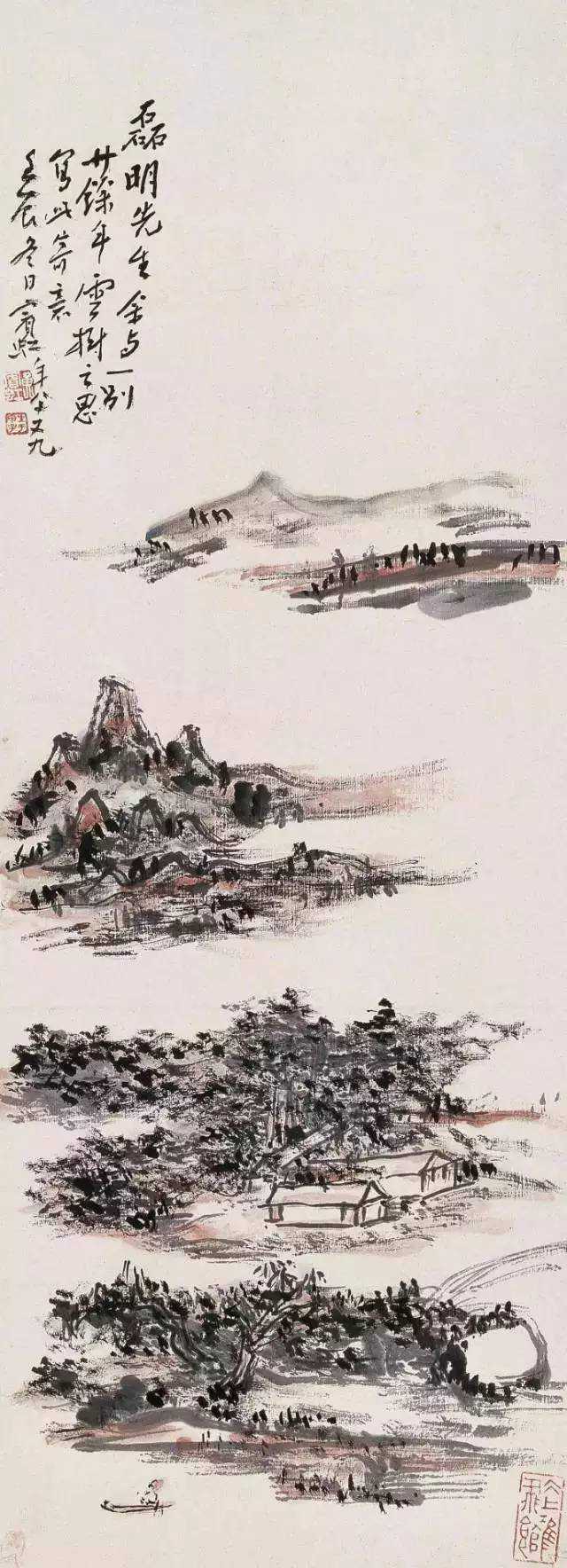 黄宾虹山水画风格独特,有的表现宏伟,有的表现荒野,有的表现幽静雅致,有的表现飘逸,河水、云朵、奔马,景物凸显各自的特色。黄宾虹一直强调,山水画必须具有“苍润之美”,即他所称的“内在美”,这是墨水画内在美品质的基本条件。