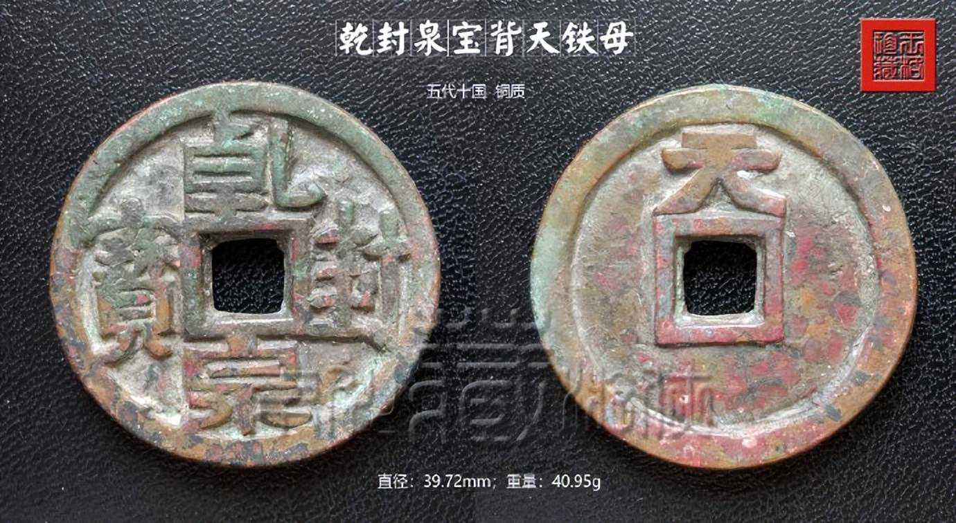 楚马殷铸乾封泉宝钱,在形制和钱文上均与唐铸乾封泉宝钱不同,楚马殷铸品形大而背多有文,如“天”、“天府”等。历谱所载,乾封泉宝背天、背天府钱,主要是铁钱为主,铜钱均载铁母,未见载入流用铜钱或者铁范铜钱(实际应该有流用铜钱)。楚马殷之乾封泉宝铁母,史出罕少,诸谱定一级,皆曰珍罕之品。