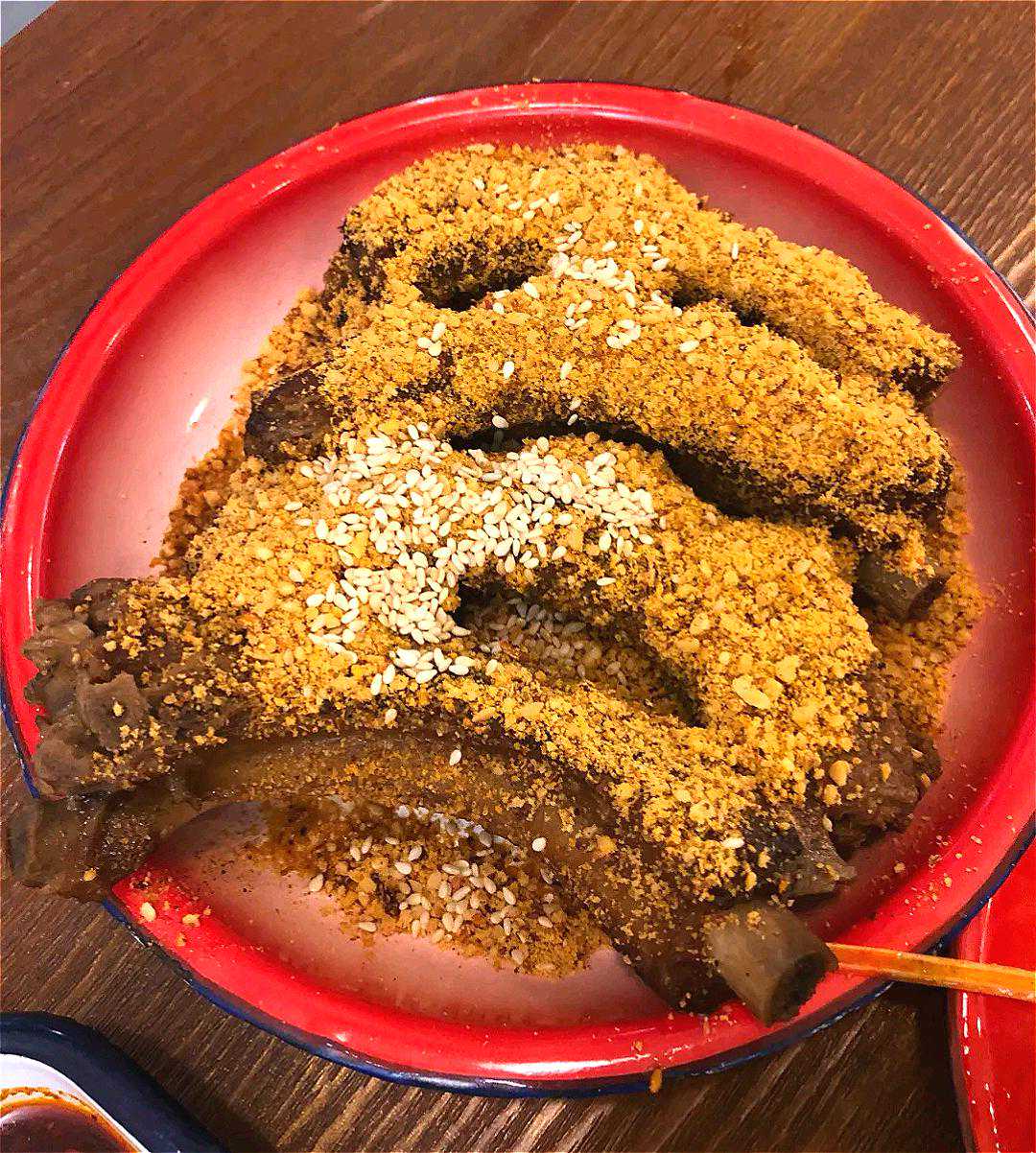 “霸王”排骨的味道真的很“霸道”!不过价格也是很“霸道”!外酥里嫩的排骨真的是“咚”大一根,裹上海椒面、花生粉、熟芝麻这些,一口咬下去口感确实巴适,味道也是香辣油润,如果不是价格有点贵的话,我觉得一个人都可以吃四根排骨。