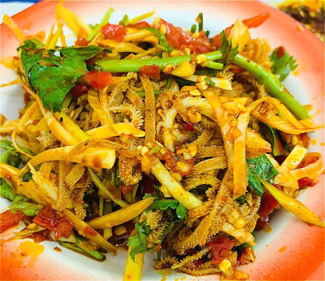 香辣脑花,这道菜还是蛮不错的,就是脑花稍微有点煮老了,要是再鲜嫩一点点,估计口味会更好。小米椒加上香菜,味道还是特别,一定要把脑花裹一层调料再吃。