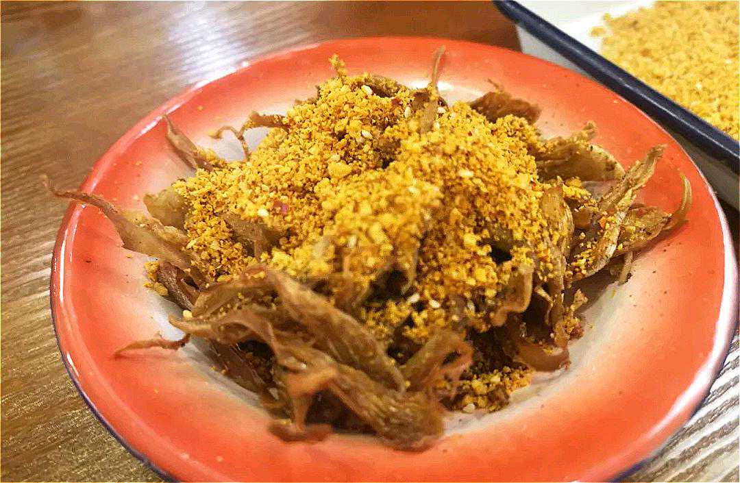 炸得略微酥脆的蘑菇,撒上一些“秘制粉面”,沾一沾、裹一裹,味道好极了!
