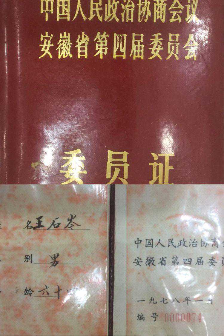 这是中国人民政治协商会议安徽省委员会颂发的政协委员证书。由于王石岑在绘画上的突出成就,先后被授予安徽省政协三、四、五届委员、常委称号。这是党和政府对王石岑的极大肯定,也是王石岑的荣誉。