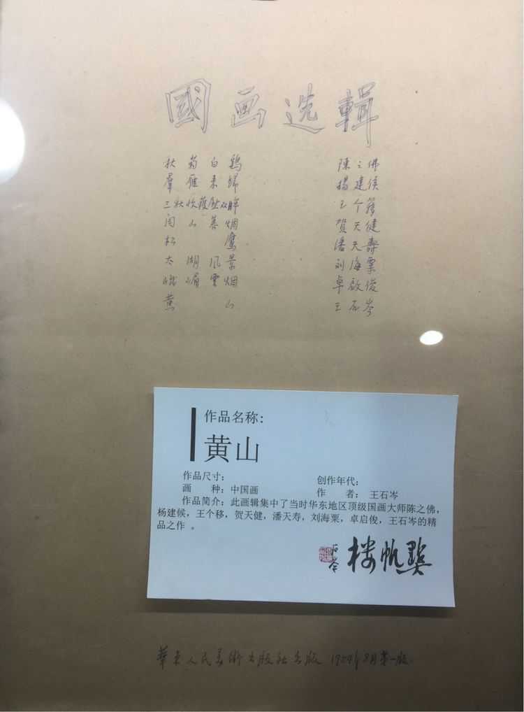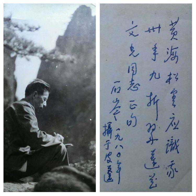 王石岑十上黄山,与黄山结下了不解之缘。王石岑很多重要作品题材都取自于黄山。这张照片来自于孙文光先生,照片背后的题字体现了作者的浪漫情怀,抒发了画家对黄山的感情。