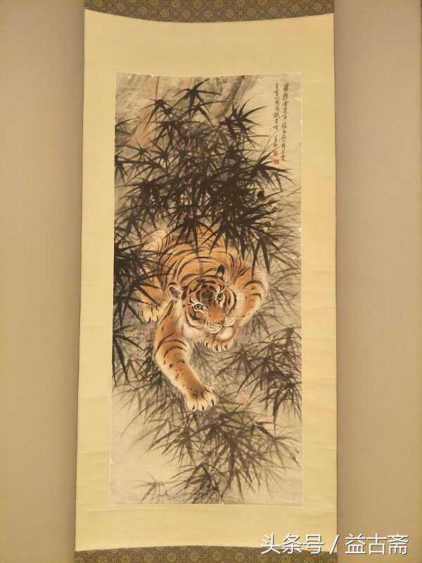 在现场,展出的47幅书画作品中,张善孖于上世纪三十年代创作的一幅《啸虎图》、张大千1945年画的《拟元人山水》作品最为抢眼。现场张善孖和张大千的作品堪称“大风堂”画派典型之作。