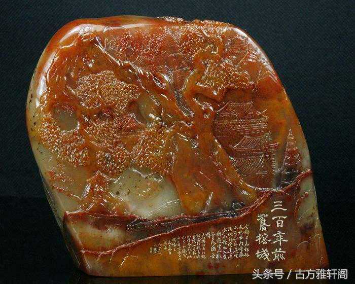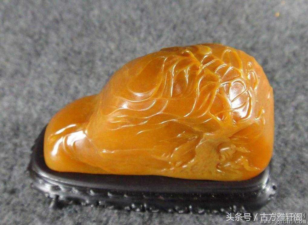 11、酱油青田:原系黄色菜花青田,经数十年摩挲色调变深至酱色,被视为珍品。