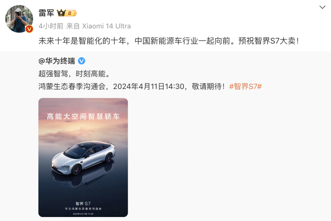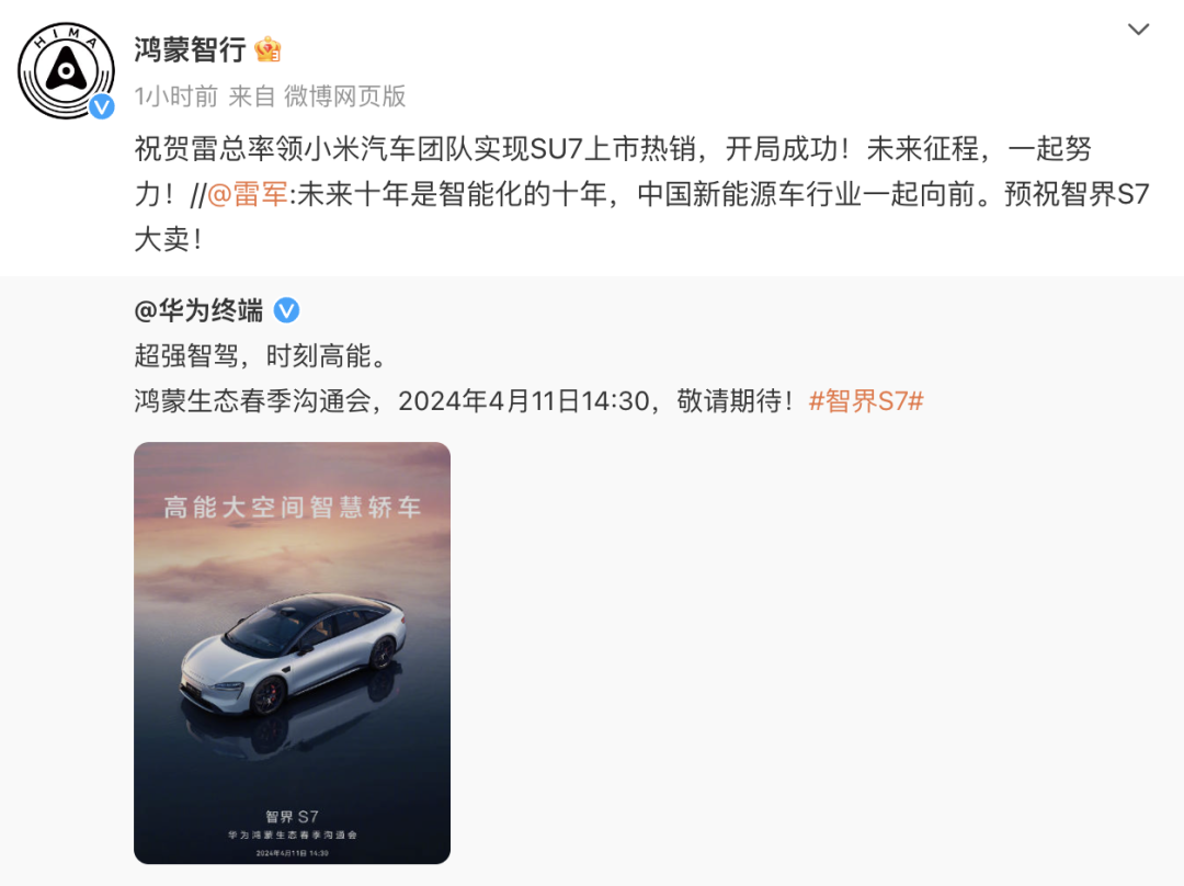 今天,华为终端正式宣布:驭光而行,轻盈入场。鸿蒙智行智界S7整装待发,华为MateBook新品亮相,尽在华为鸿蒙生态春季沟通会,4月11日14:30,敬请观看!