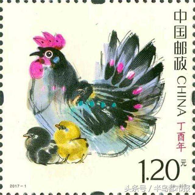 2017年是农历的丁酉年,即鸡年。中国邮政将于2017年1月5日发行《丁酉年》特种邮票,全套2枚,图案出自著名艺术家、北京奥运会吉祥物“福娃”的设计者韩美林之手。这套邮票图案表现的是生肖鸡幸福美满的一家,既突出了雄鸡起舞、大吉大利的生肖贺岁主题,又展现了和谐幸福的家庭生活,延续了第四轮生肖邮票开门票——2016年《丙申年》生肖猴票“合家欢”的主题。第一枚画面表现了一只威武雄壮、高傲奔放的大公鸡;第二枚画面表现了呵护幼子、温婉柔美的鸡妈妈与可爱的两只小鸡。