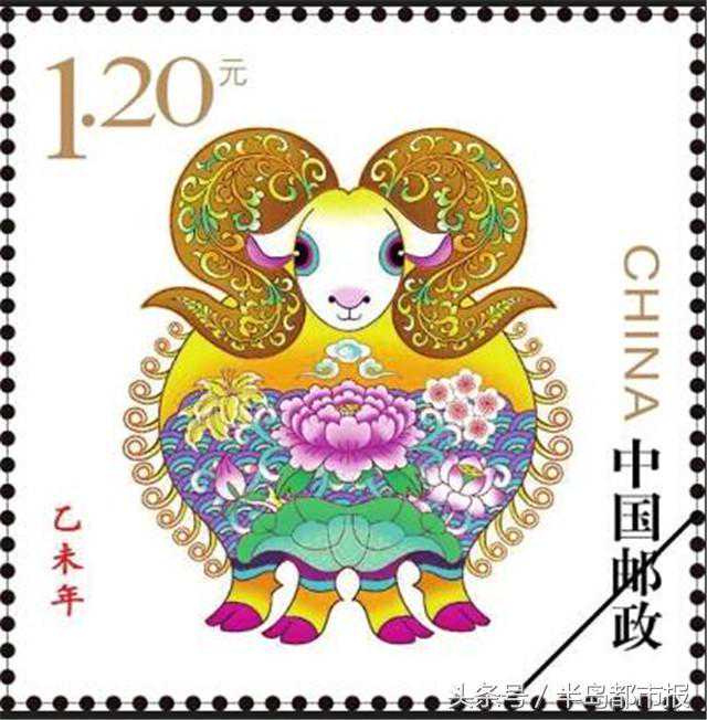 2015《乙未年》(羊年)特种邮票1套1枚,面值1.20元,邮票上的羊以绵羊作为基础造型,羊角装饰有缠枝花草纹,羊身上为牡丹、莲花等花卉图案,并伴以祥云、水波纹,画面蕴含着吉祥、圆满和幸福绵长的寓意,寄托了对新年的美好祝福。邮票图案中的牡丹花为三层,两侧为12卷毛,寓意为我国生肖邮票发行已进行了第三轮,每轮12套邮票。