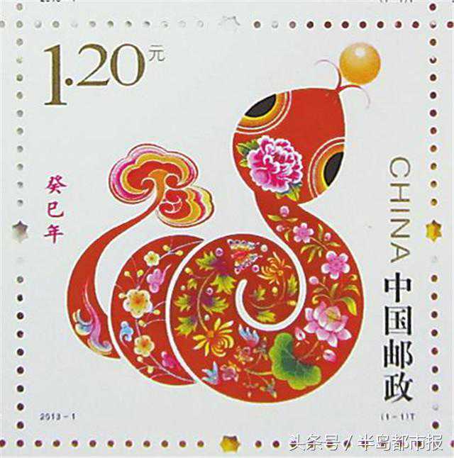2013《癸巳年》(蛇年)特种邮票是由清华大学美术学院教授吴冠英设计。本次发行的《癸巳年》特种邮票1套1枚,面值1.20元,同时发行小本票一本。邮票参考了古代神话故事和中国传统文化中的符号元素。蛇的尾部幻化为两株灵芝神草,寓意吉祥安康。蛇身为红色,并装饰春桃、夏荷、秋菊、冬梅,表现了四季和谐祥瑞之意。