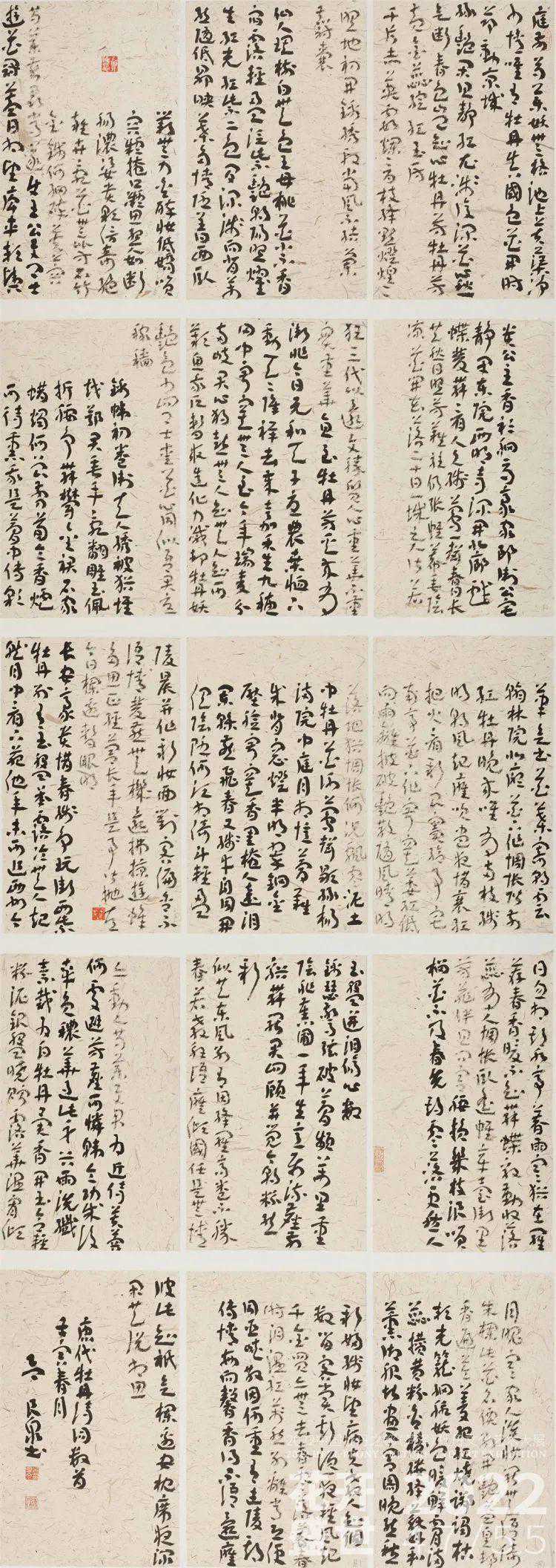 该作品选数首唐代牡丹诗词为内容,书体为小字类章草,十五块云龙纸拼接作为形式,秃峰狼毫书写更显其古拙,同时融入了篆隶之气。