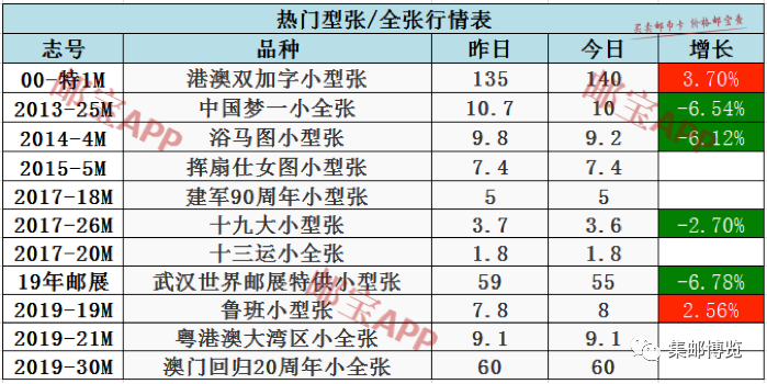 特别提醒:邮宝APP中所有产品的价格为市场大宗交易价格、且不含税点。零售价可能在此基础上浮动10-20%。另外,因篇幅所限,本文亦未列全邮币卡的所有品种。查询更多价格,请登录邮宝APP。