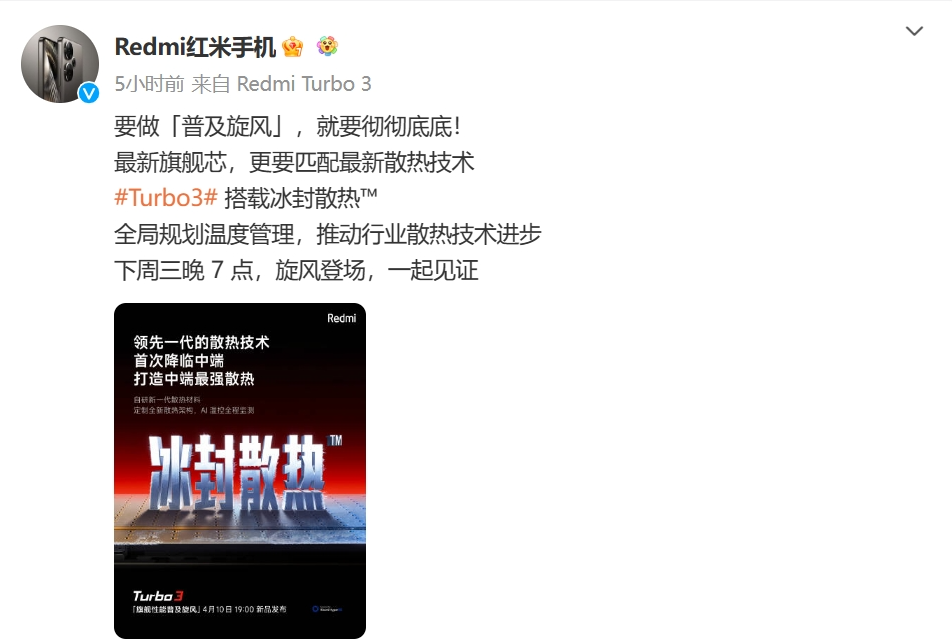 今日,官方正式宣布,RedmiTurbo3将于4月10日晚7点发布。