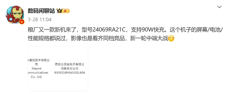 此前,小米旗下一款型号为24069RA21C的新机通过了3C认证。