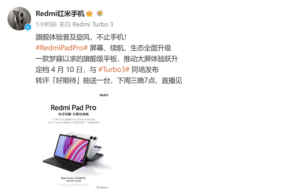 官方今日还宣布了RedmiPadPro将与RedmiTurbo3同场发布。
