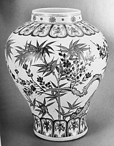 朝鲜十五世纪青花松竹梅纹罐资料图片