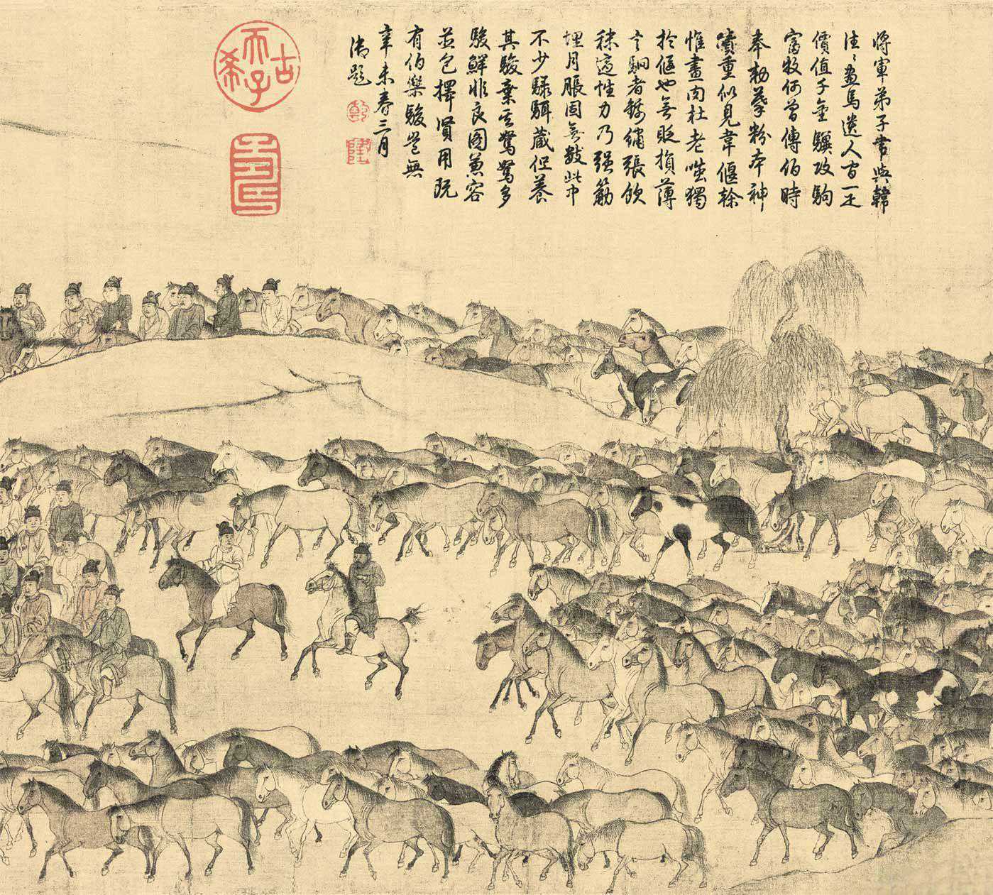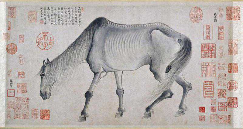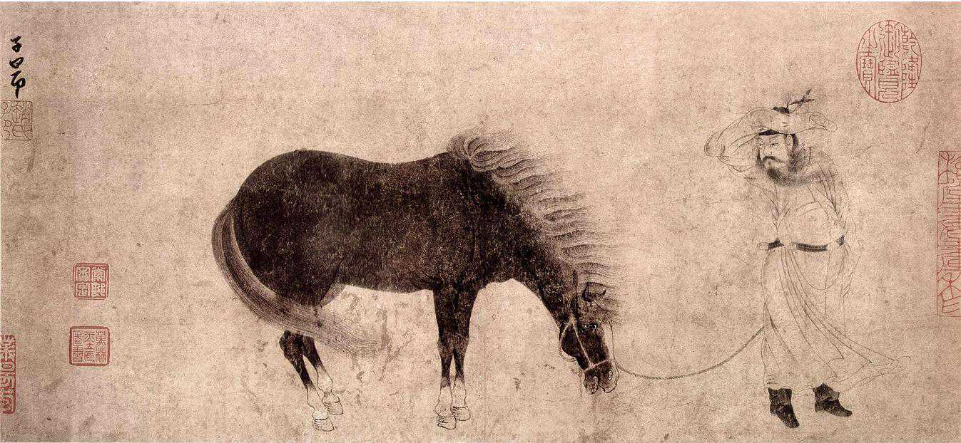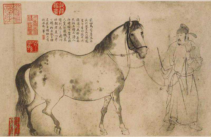 宋代画家画马,李公麟、马和之、陈居中、龚开都是这一时期的代表人物。李公麟基本沿袭了韩干、韦偃一派的技法,以白描勾勒为主,略施水墨完成;线条细挺而浑厚,墨色滋润而明快,将马的形态表现得淋漓尽致。