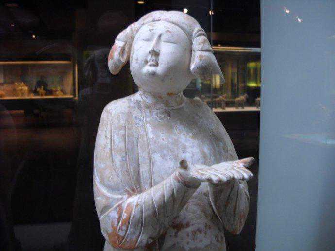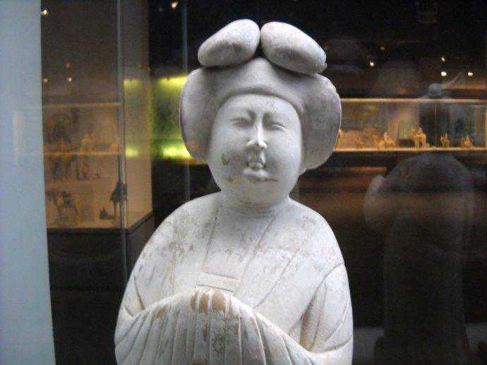 博文中展示的是唐代时期的“彩绘三彩釉女子陶俑”。唐朝妇女爱美,特别注重发式新奇与面部修饰。这一时期妇女的发式主要有半翻髻、双环望仙髻、囚髻、抛家髻、惊鹄髻、螺髻、百合髻、圆鬟髻等。发式之上插饰各种珠翠花钗、步摇、梳子之类。为追求新奇之美,唐代妇女常创造出新的发式,有的高出面部两倍以上,杨贵妃为标新立异,竟以假髻为饰。